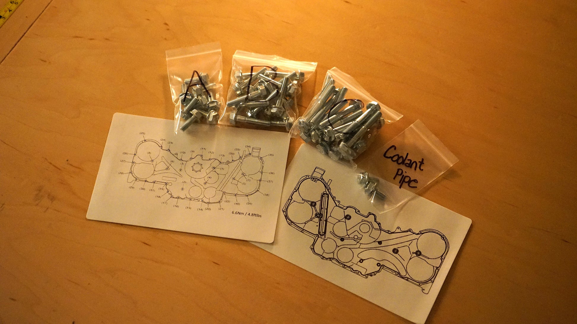 Kit comes with the 3 different bolt sizes needed, 2 bolts for the front lower coolant pipe, and a two-faced diagram showing their locations and torque sequence with specs.